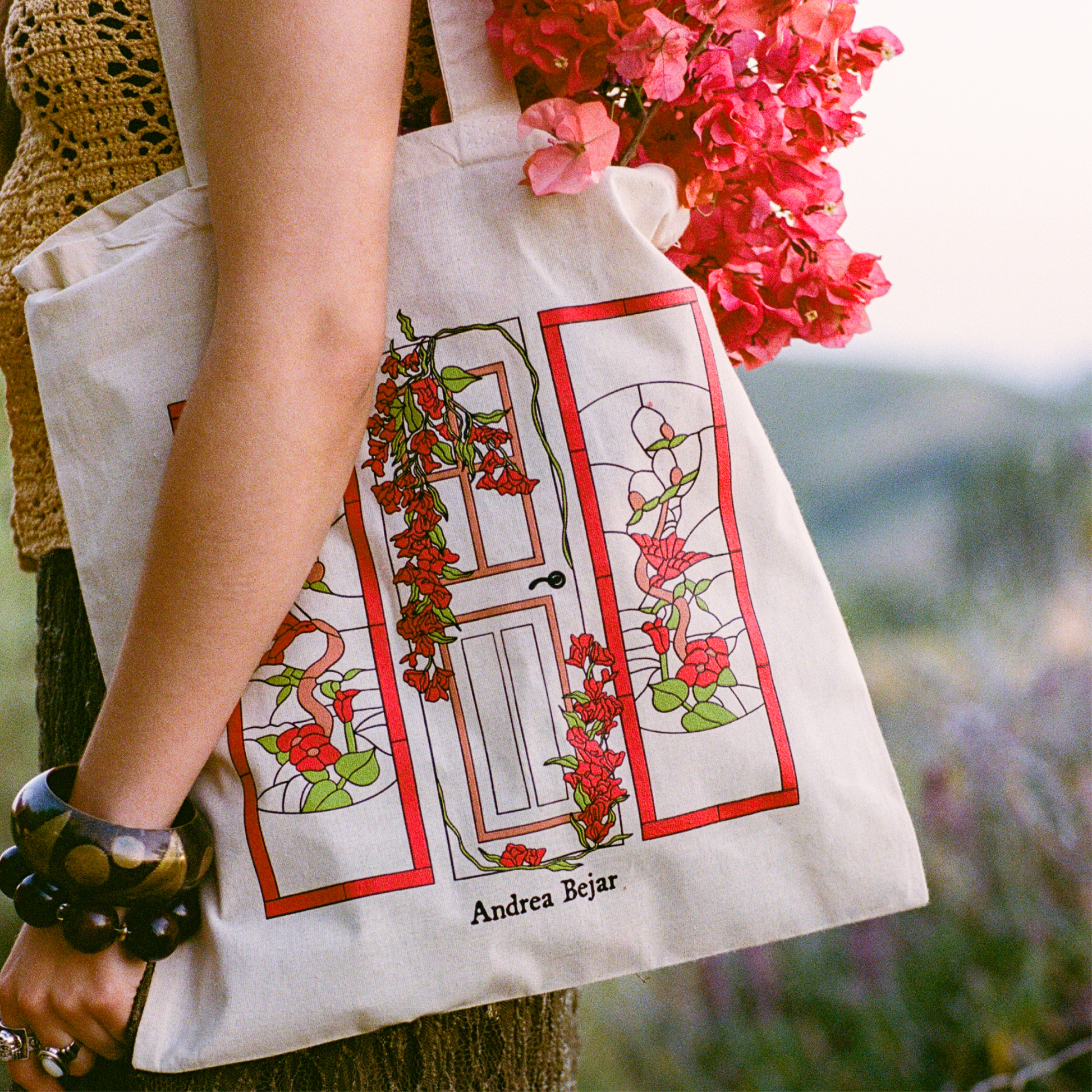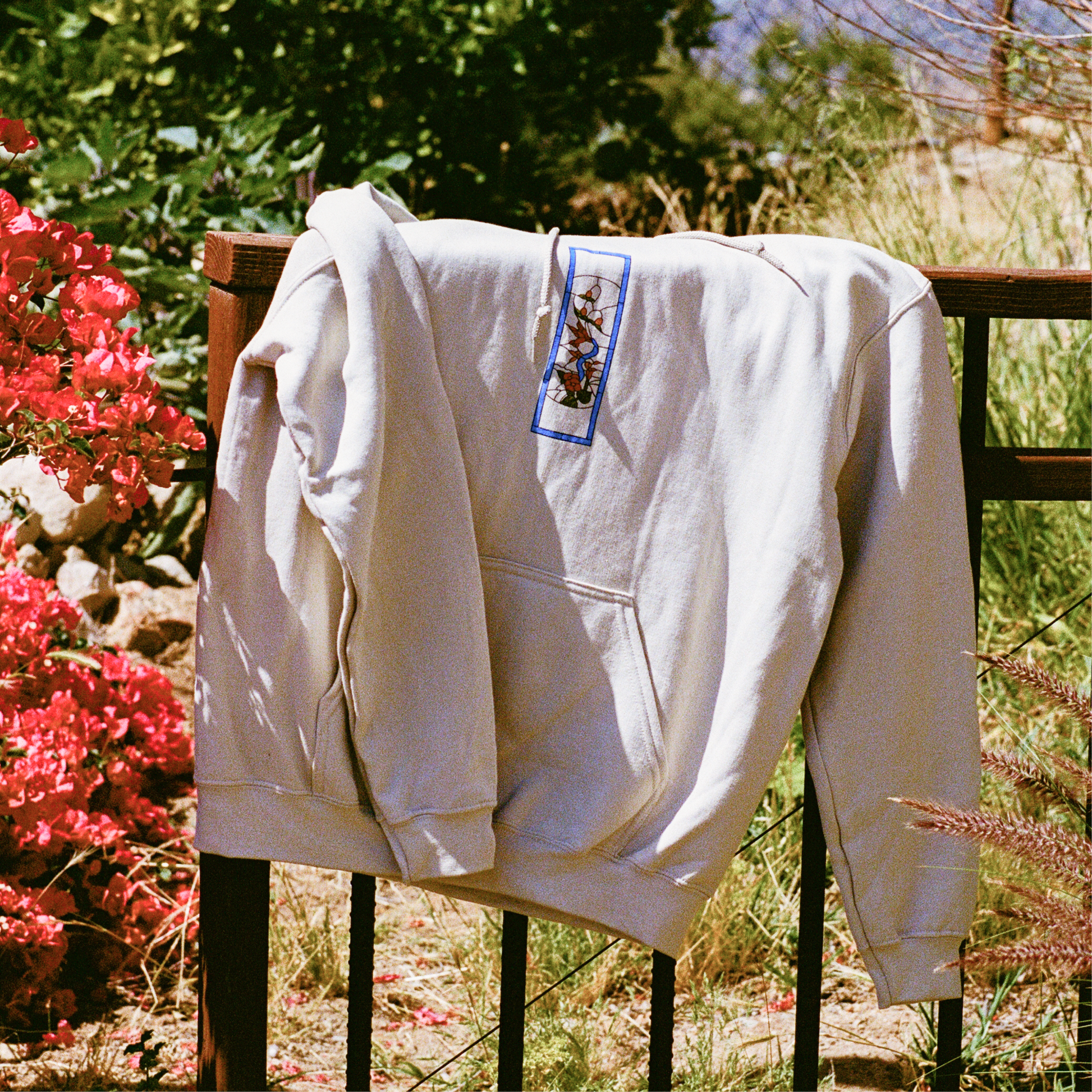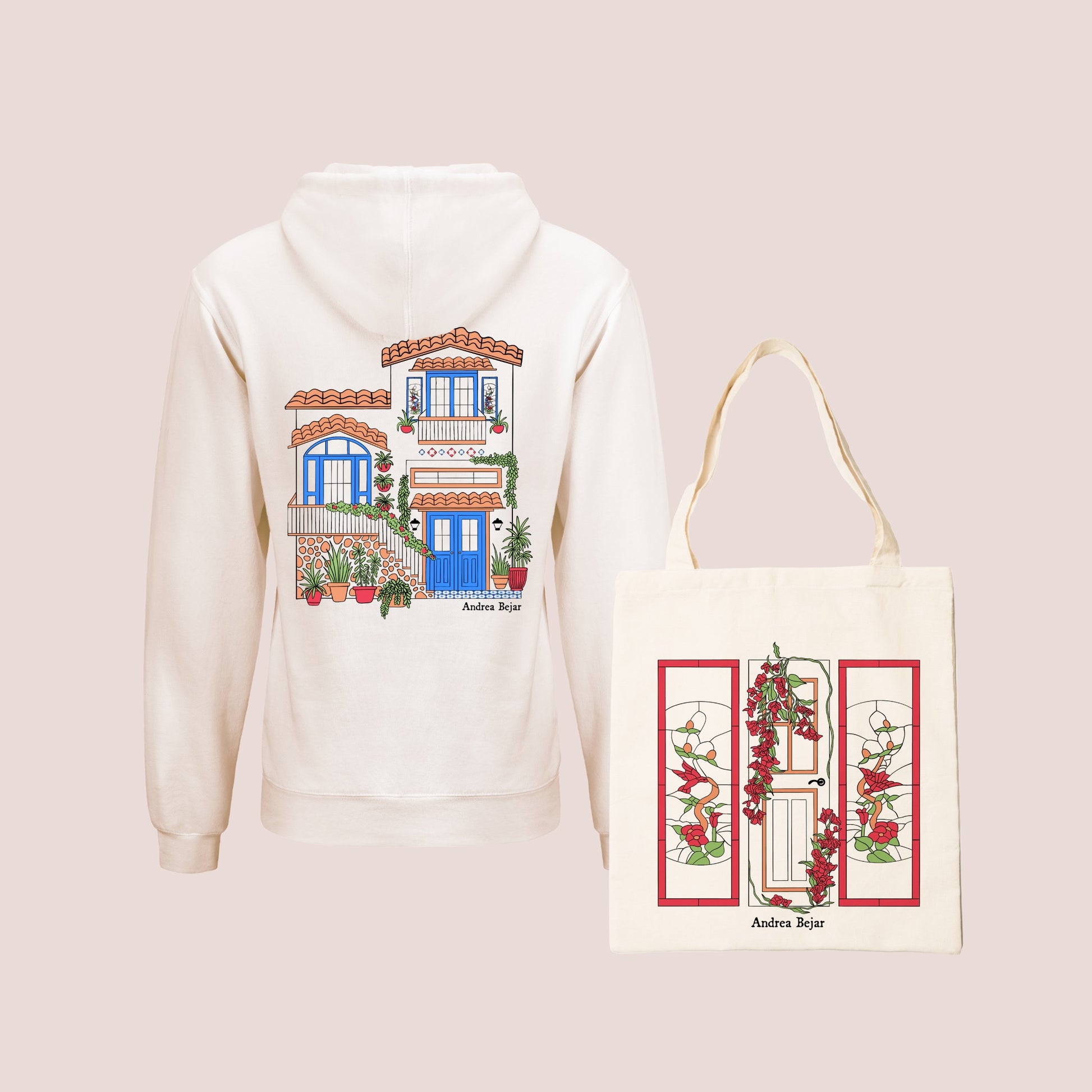 The Nostalgia Bundle includes a cozy hoodie featuring a drawing of my childhood home in Mexico on the back and a stained glass design on the front along with a tote bag featuring the same stained glass design. This bundle was designed to share a piece of my heart with you ❤️